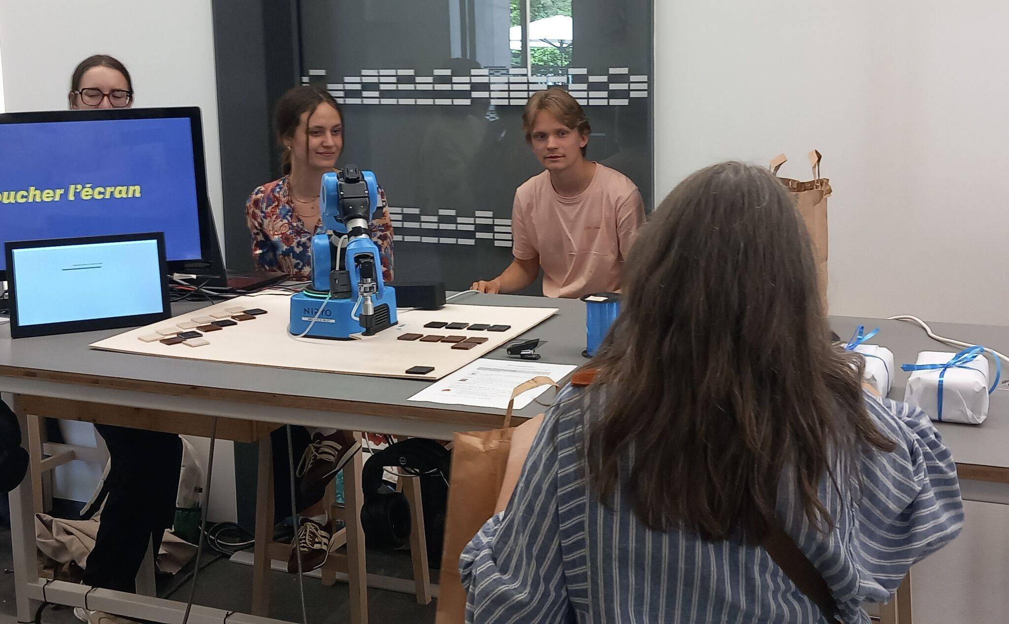 Ils ont, ensemble, imaginé une mise en scène dans une chocolaterie où les participants volontaires interagissaient pendant 10 minutes avec un cobot exécutant une opération de mise en boîte de chocolats.