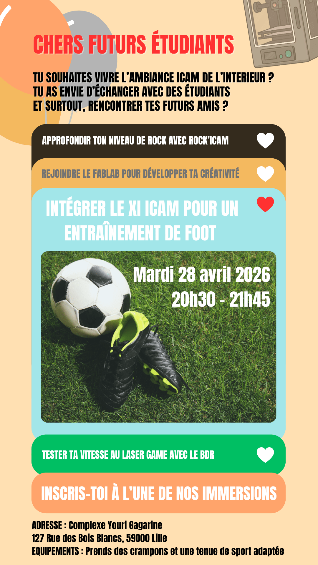 L’équipe du XI ICAM a le plaisir de vous convier à sa prochaine session de football. Cet événement est l’occasion idéale pour se retrouver sur le terrain, partager un moment sportif et renforcer la cohésion au sein de notre école. Tous les étudiants, quel que soit leur niveau, sont les bienvenus pour participer à cette rencontre.