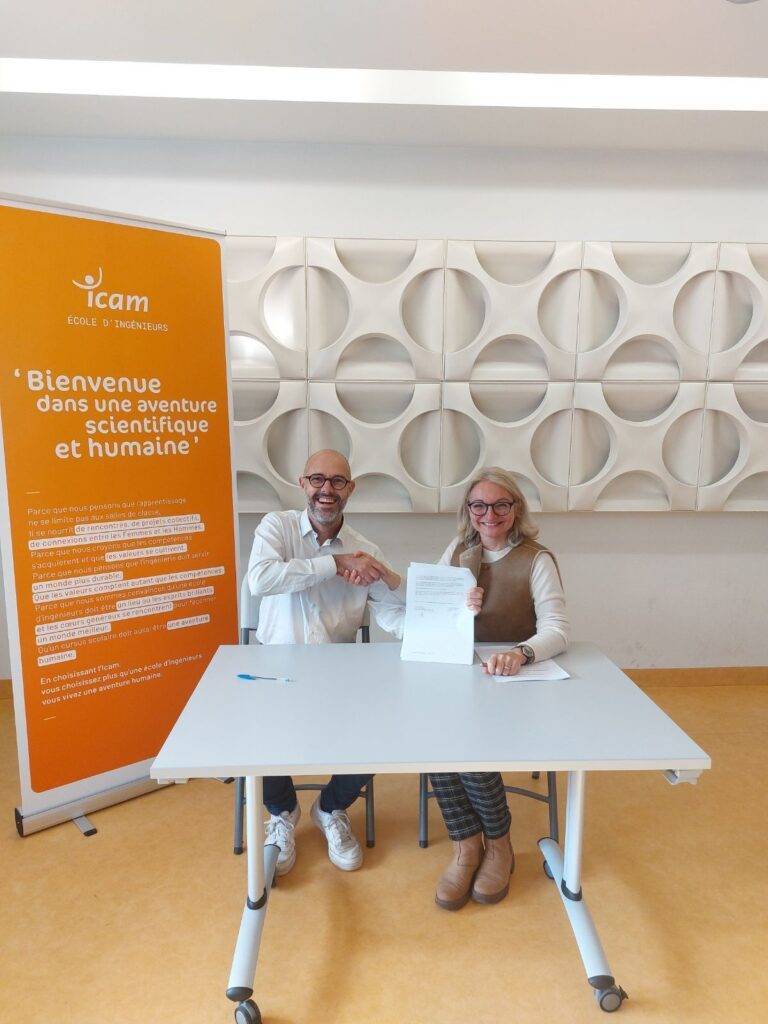 Johann Legault, directeur des ressources humaines de Syxperiane et Carole Marsella, directrice générale déléguée en charge de la coordination des sites Icam en France ont signé, le 3 novembre dernier, une convention de partenariat d’envergure nationale pour les deux prochaines années. Objectif : renforcer les passerelles entre formations d’ingénieurs et métiers du numérique.